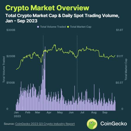 In the third quarter of 2023, the total crypto market capitalization witnessed a decline of nearly 10%, amounting to a loss of $119.1 billion. This drop marks a 16.3% decrease from the local peak observed on April 17. Trading volumes have also been on a downward trend, with average daily trading volume in Q3 at $39.1 billion, reflecting an 11.5% decline from Q2.