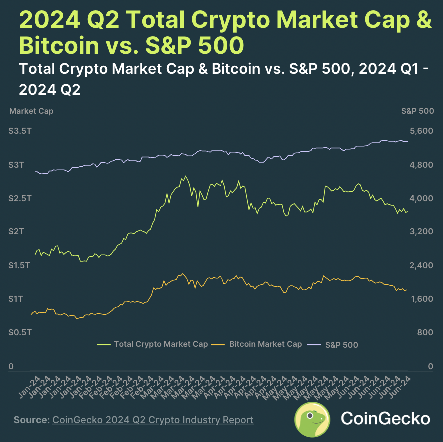 The second quarter of 2024 witnessed a sharp downturn in the cryptocurrency market, following a remarkable near-record high in Q1. The total market capitalization dropped by 14.4%, settling at $2.43 trillion by the end of June.
