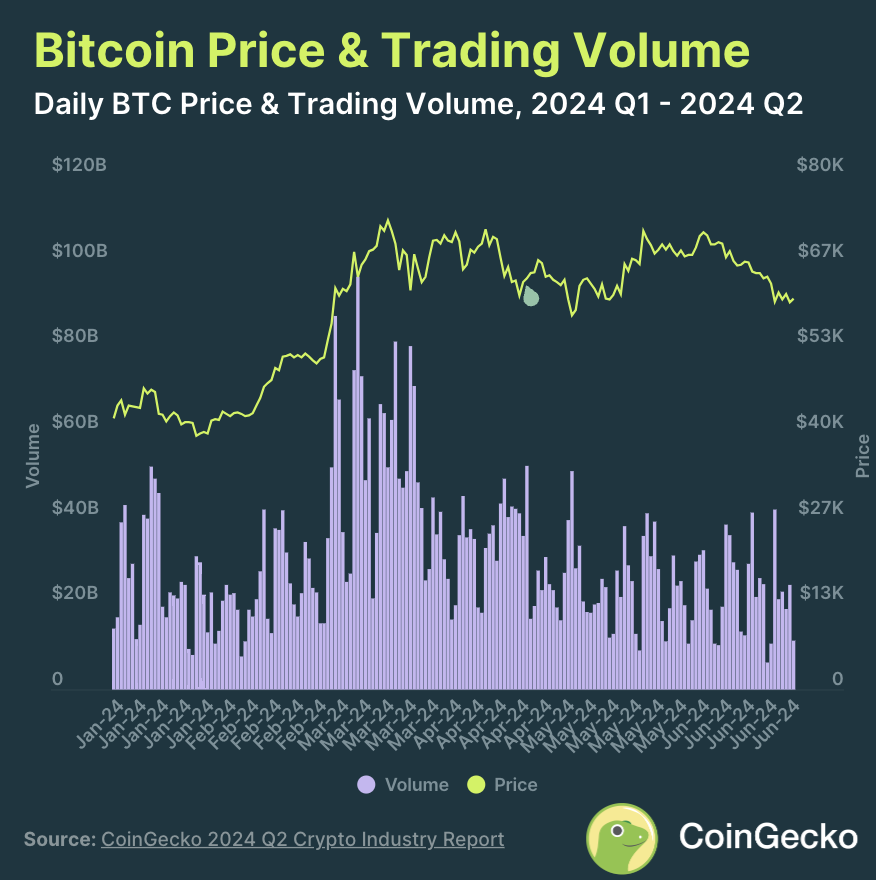 - Bitcoin’s Quarterly Performance: Bitcoin ended Q2 at $62,734, marking an 11.9% decline. After hitting a new high of $73,098 in mid-March, Bitcoin’s value fluctuated between $58,000 and $72,000. The halving event did not significantly impact its price. Bitcoin’s trading volume also dropped, averaging $26.6 billion daily, a 21.6% decrease from the previous quarter.