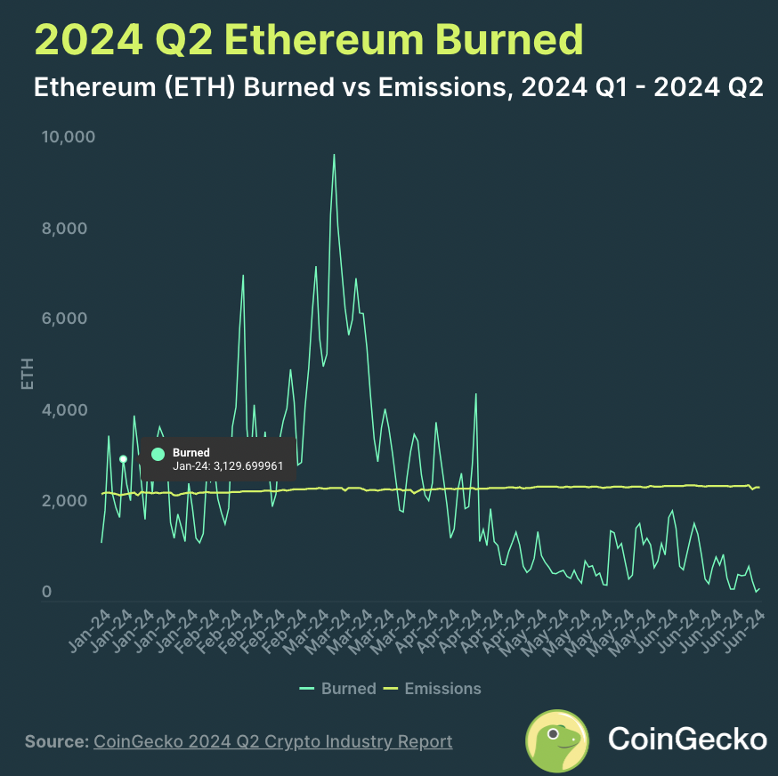 - Ethereum’s Inflationary Period: Ethereum saw an increase of 120,818 ETH in circulation in Q2, with emissions surpassing burns. Only seven days in Q2 had burns exceeding emissions, compared to 66 days in Q1. The largest contributor to ETH burns was ETH transfers, which burned 6,838 ETH in Q2.