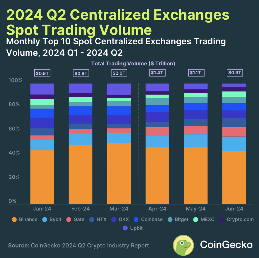 - Centralized Exchanges Trading Volume: The spot trading volume on centralized exchanges (CEX) totaled $3.40 trillion in Q2, a 12.2% drop from Q1. Binance remained the top CEX, holding a 45% market share despite a decrease in trading volume. Bybit rose to the second-largest spot CEX, surpassing Upbit, with a 12.6% market share by June.
