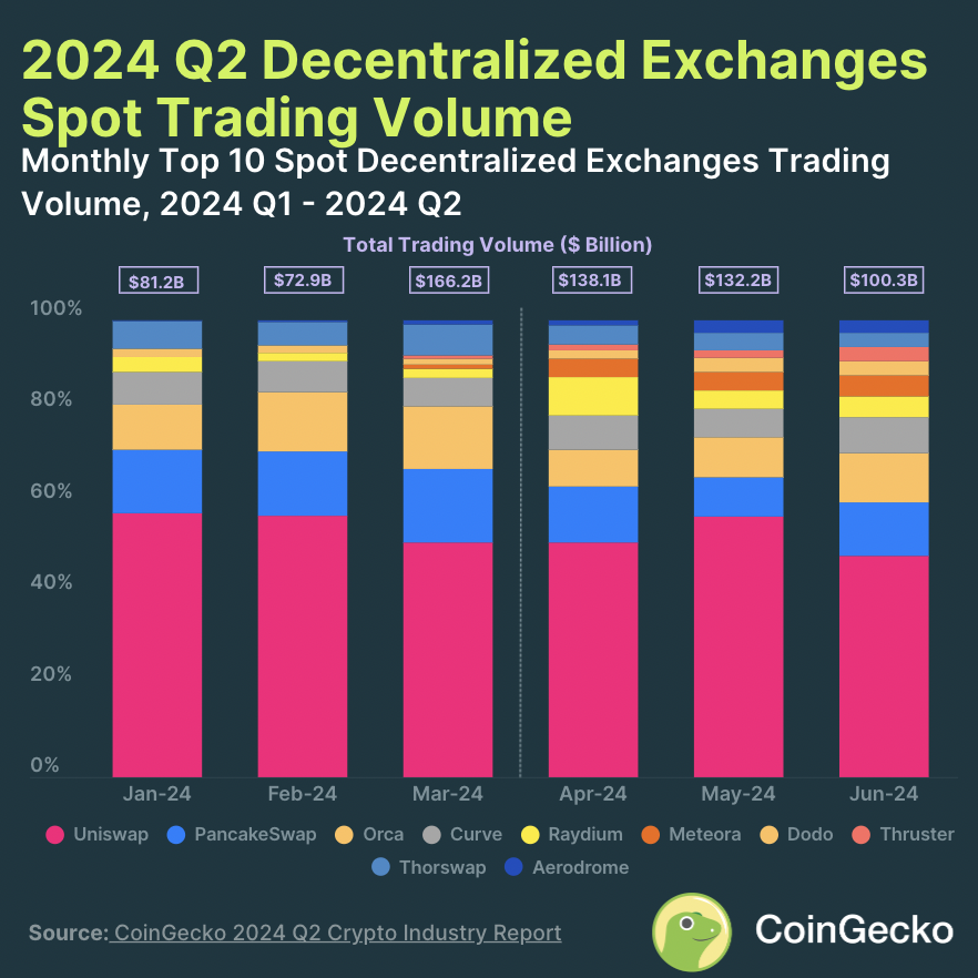 - Decentralized Exchanges Trading Volume: Decentralized exchanges (DEX) saw a 15.7% increase in trading volume, reaching $370.7 billion in Q2. This growth was driven by a surge in meme coins and airdrops. Uniswap continued to lead the DEX market with a 48% share. Thruster and Aerodrome were notable performers, with Thruster’s volume increasing by 464.4% and Aerodrome’s by 297.4%, both benefiting from unique trading conditions in their ecosystems.