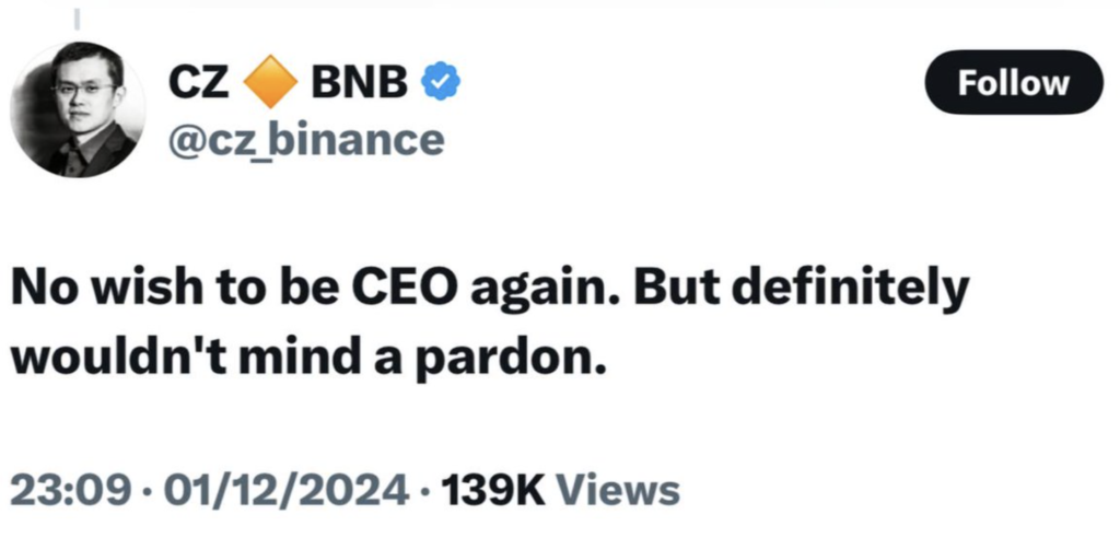 CZ Won’t Return as Binance CEO but Open to Presidential Pardon