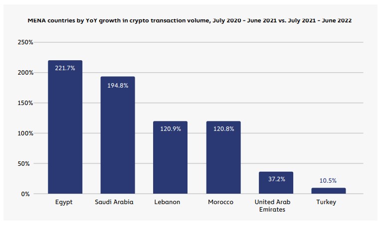 Egypt’s position at the intersection of growing crypto remittances and increased inflationary pressures help explain why it’s the fastest growing crypto market in all of MENA this year. Between July 2021 and June 2022, transaction volume in Egypt tripled compared to the preceding year. Turkey, meanwhile, remains the largest cryptocurrency market in the region, its citizens having received $192 billion from July 2021 to June 2022, but has seen much slower YoY growth.