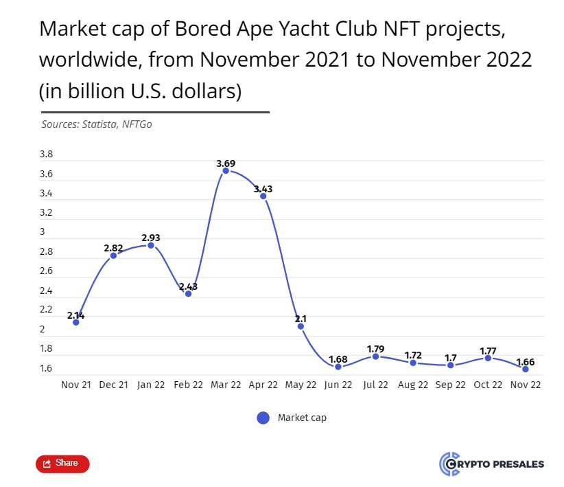 Statista and NFTgo data show that the market cap of Bored Ape Yacht Club NFT projects available on the Ethereum blockchain and listed on OpenSea was worth roughly $2.1bn in November last year. This value jumped by 72% in just four months, reaching $3.69bn in March.