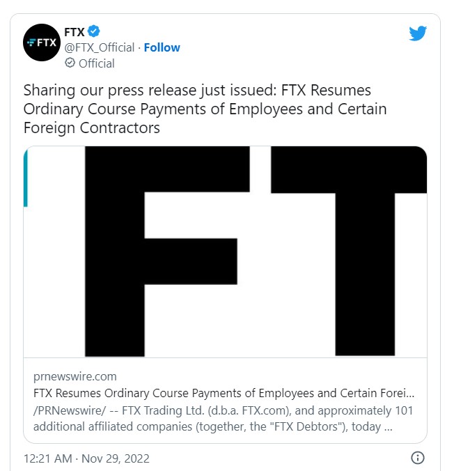 FTX Trading Ltd., and approximately 101 additional affiliated companies (together, the "FTX Debtors"), announced that most FTX subsidiaries around the world are resuming ordinary course payment of salary and benefits to employees worldwide and ordinary course payments to certain non-U.S. contractors and service providers.