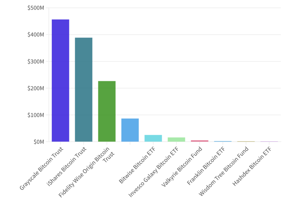 In the same timeframe, the Fidelity Wise Origin Bitcoin Fund (FBTC) and the Grayscale Bitcoin Trust (GBTC), recently converted into an ETF, saw trading volumes of around 5 million and 10.5 million shares, respectively.