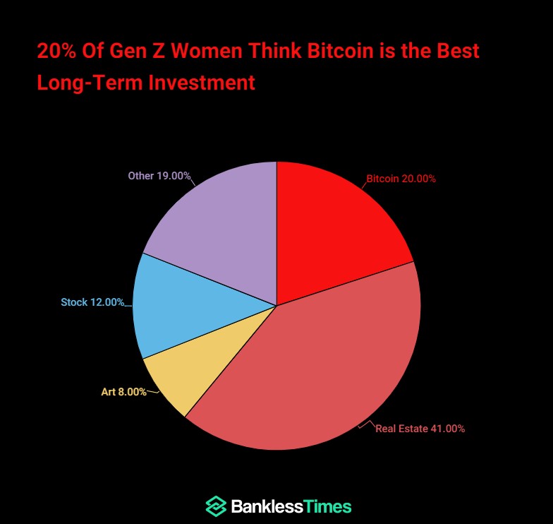 More Gen Z women (20%) believe that Bitcoin is a better long-term investment than stocks (12%), according to BanklessTimes.com.