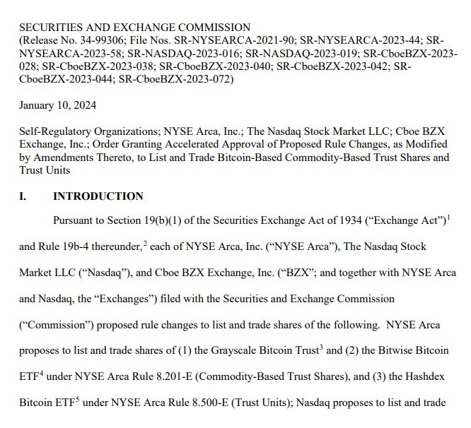 On January 10, the securities regulator granted approval for the 19b-4 applications submitted by ARK 21Shares, Invesco Galaxy, VanEck, WisdomTree, Fidelity, Valkyrie, BlackRock, Grayscale, Bitwise, Hashdex, and Franklin Templeton. This approval signifies the acceptance of rule changes enabling the listing and trading of spot Bitcoin ETFs on their respective exchanges.