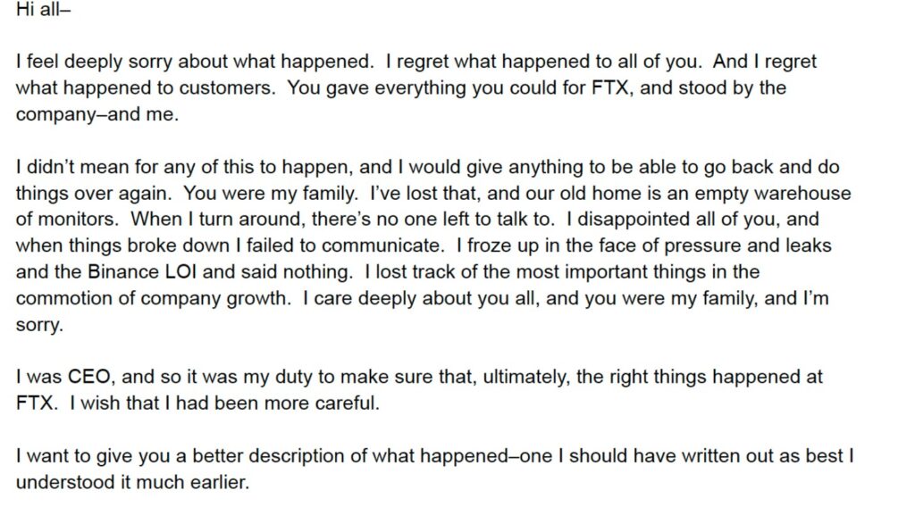 The founder of failed crypto exchange FTX, Sam Bankman-Fried, apologized in a letter to his former employees for his role in the collapse.
