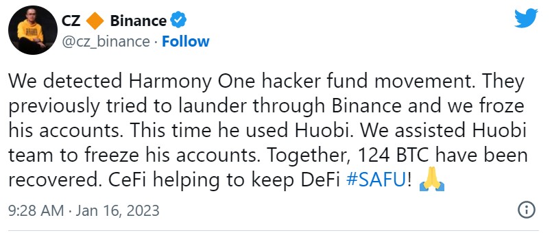 The security teams at crypto exchanges Binance and Huobi collaborated to stop and retrieve 121 Bitcoin (BTC) worth $20,803 from the individuals responsible for the Harmony bridge exploit.
