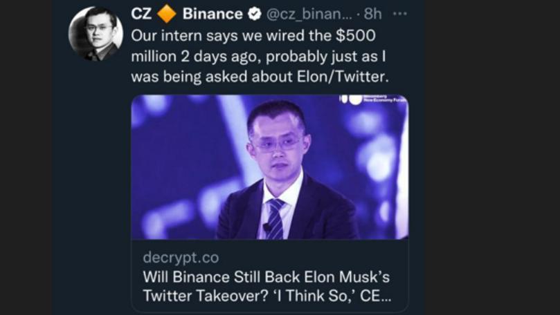 CZ said in a tweet that Binance had wired some $500 million as part of the deal two days ago. He explained that "Our intern says we wired the 500$ million 2 days ago, probably just as I was being asked about Elon/Twitter".