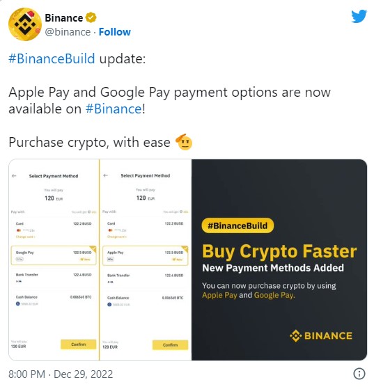 The integration of these payment methods into the cryptocurrency industry has been gradual. As the largest cryptocurrency exchange platform by volume, Binance has now enabled users to purchase cryptocurrencies using Apple Pay and Google Pay.