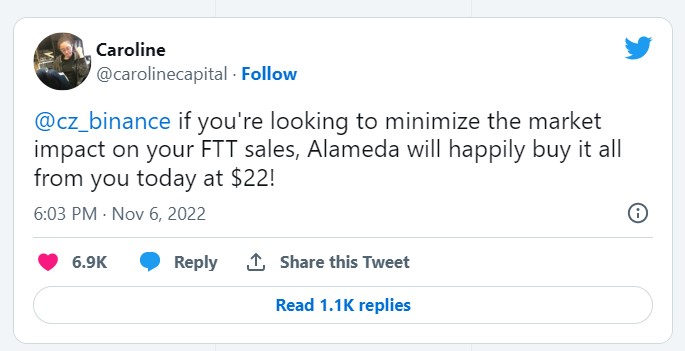 She offered to buy Binance’s remaining FTT for a set price of $22 if Zhao was looking to “minimize the market impact” of the move as well.