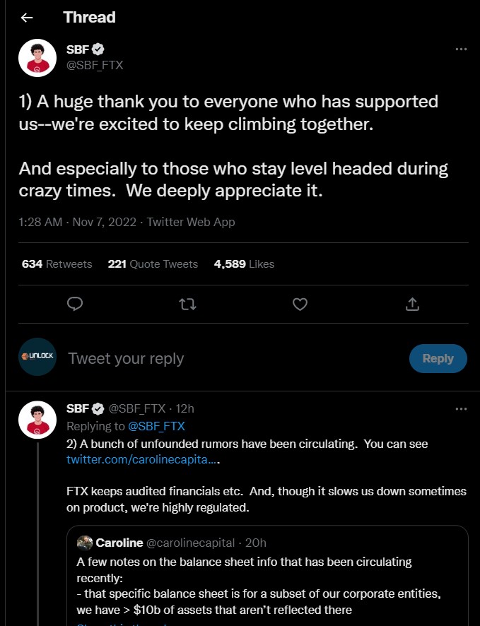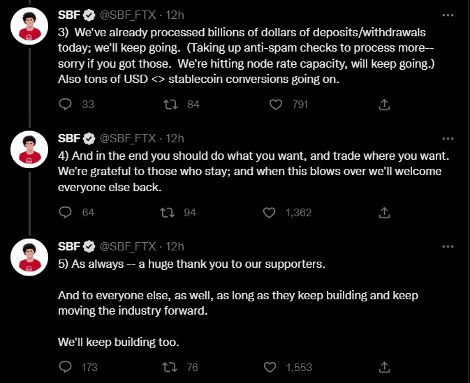 In a tweet thread, SBF commented on the situation as he thanked FTX supporters and reassured them that the exchange is doing fine and that billions of dollars of deposits/ withdrawals have been processed today.