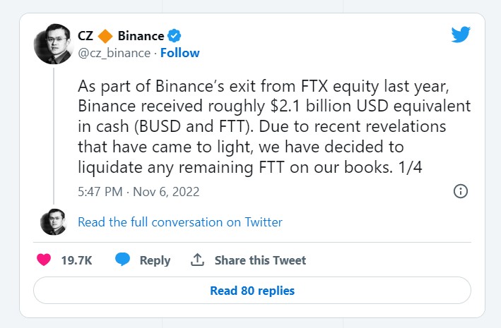 Binance CEO CZ said that his cryptocurrency exchange is liquidating its holdings of FTT, the native token of rival exchange FTX.
