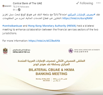 The United Arab Emirates' Central Bank (CBUAE) and the Hong Kong Monetary Authority (HKMA) convened a bilateral meeting in Abu Dhabi with the objective of enhancing collaboration between their respective financial service sectors.