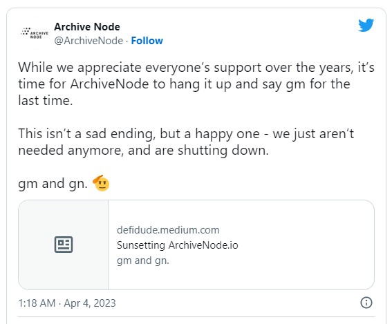The founder of ArchiveNode.io, also known as "DeFi Dude," has announced the shutdown of the service after achieving its goal of providing free Ethereum mainnet archive node services to developers, students, and researchers.