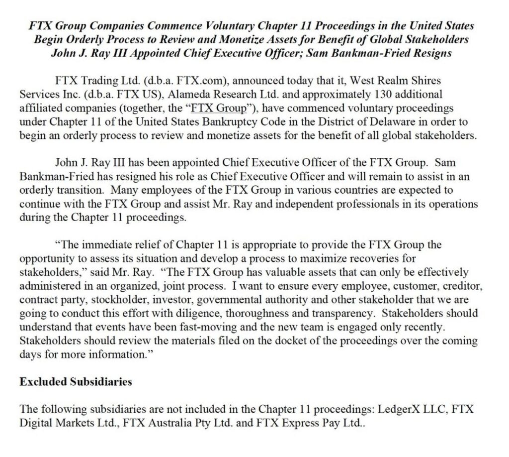 He tweeted, "Hi all: Today, I filed FTX, FTX US, and Alameda for voluntary Chapter 11 proceedings in the US. I'm really sorry, again, that we ended up here. Hopefully things can find a way to recover. Hopefully this can bring some amount of transparency, trust, and governance to them. Ultimately hopefully it can be better for customers."