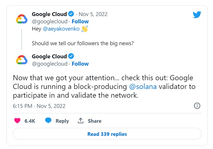 In a Twitter thread, Google Cloud revealed that as well as running a Solana validator “to participate in and validate the network,” it is planning to bring its Blockchain Node Engine to the Solana chain in 2023. The Blockchain Node Engine is a “fully-managed node hosting service” run by the provider, which already supports the Ethereum blockchain.