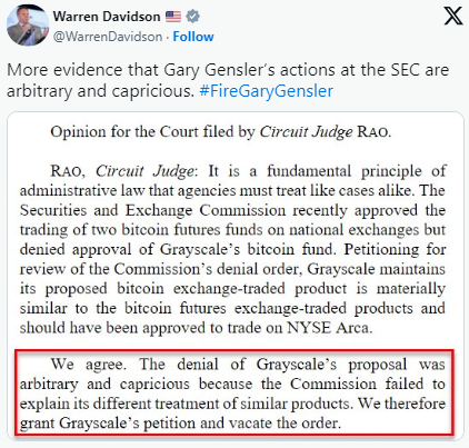 In fact, Congressman Davidson references a judicial opinion penned by Circuit Judge Rao, stating that the court concurs with the view that the SEC's rejection of Grayscale's ETF proposal lacked a logical basis and was inconsistent. The opinion points out the Commission's failure to justify the dissimilar treatment of comparable products. Consequently, the court endorsed Grayscale's plea and invalidated the SEC's directive.