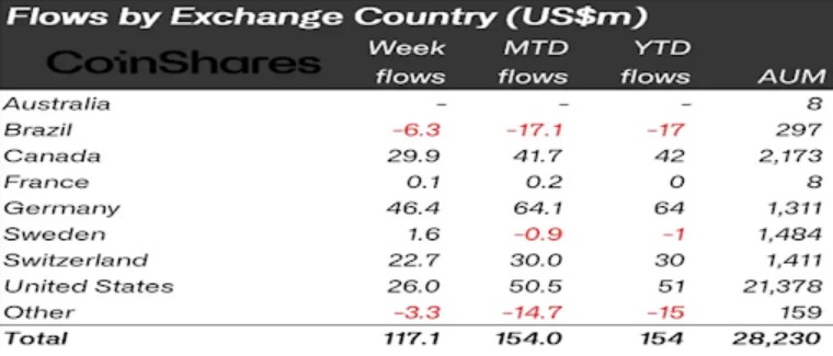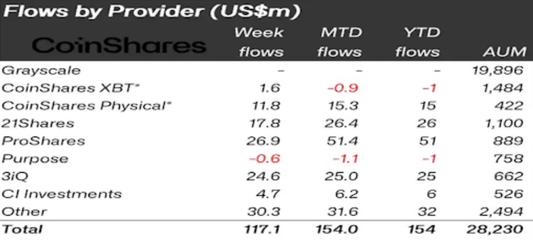 According to the latest weekly report by CoinShares on financial flows in asset and digital currency funds, digital assets experienced positive inflows of $117 million last week, which is the highest since July 2022. The total assets under management (AuM) increased to $28 billion, a growth of 43% from its lowest level recorded in November 2022, due to the turmoil faced by the crypto sector over the past year.