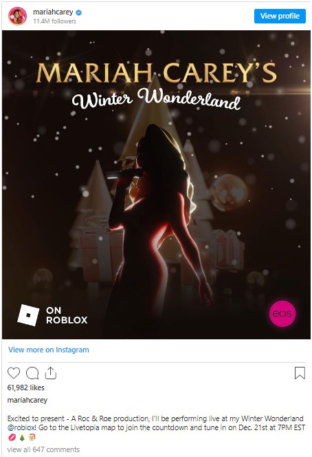 Mariah Carey is set to perform a series of virtual concerts on Roblox’s Livetopia platform this month, with her project dubbed ‘Mariah Carey’s Winter Wonderland’.