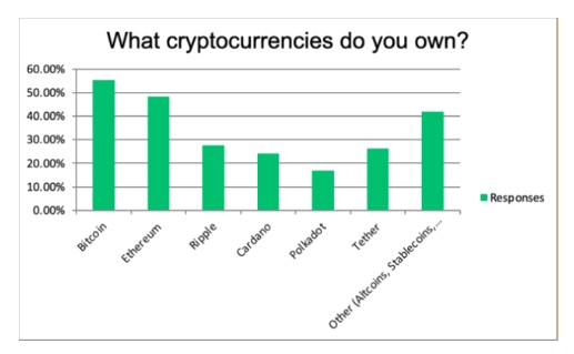 In addition to that, the survey reveled that the majority, 55%, own Bitcoin. Ethereum is the second most popular, followed by XRP, Tether, and other alternative cryptocurrencies.