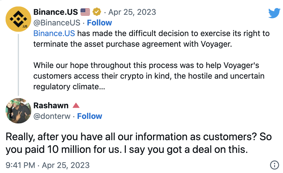 Voyager and the Voyager Official Committee of Unsecured Creditors expressed their disappointment with Binance.US's decision through their tweets, and the latter is currently investigating potential claims against Binance.US.