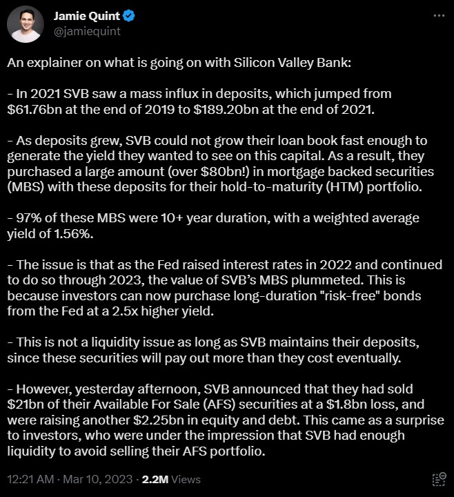 While this is not a liquidity issue as long as SVB maintains its deposits, the bank has announced that it had sold $21bn of its Available For Sale (AFS) securities at a $1.8bn loss, and was raising another $2.25bn in equity and debt.
