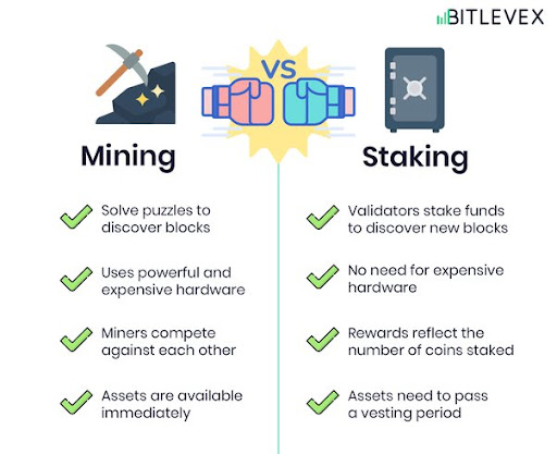 Staking serves a similar purpose to mining, but is different in many ways. Mining requires large up-front expenditures in the form of powerful hardware and energy consumption, resulting in economies of scale, and promoting centralization.