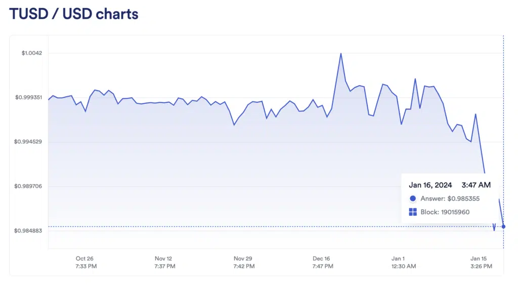 According to Chainlink, TUSD was trading at $0.985 on Jan. 16, falling significantly below its peg around Jan. 15 at 11:00 UTC, reaching $0.984 at 23:15. During this period, TrueUSD holders reportedly cashed out hundreds of millions of tokens, shifting towards rival stablecoin Tether (USDT).
