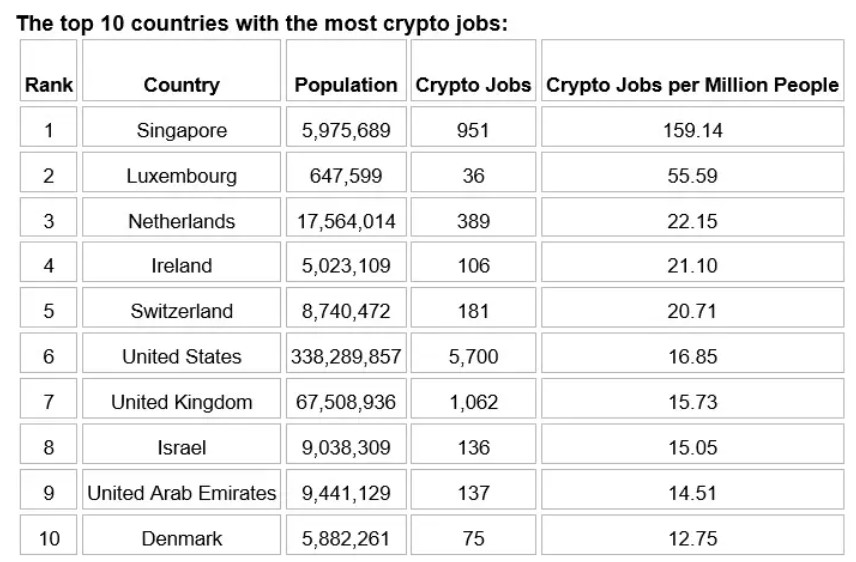 Overall, Singapore has the highest number of crypto career listings at 159.14 jobs per a million people, almost three times as many as any other country.