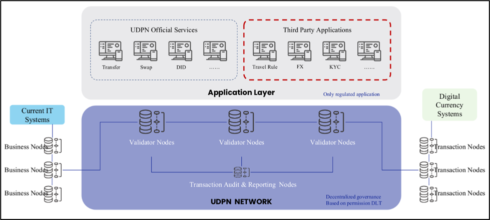 UDPN's architecture includes a permissioned, decentralized network of on-chain Validator Nodes, along with off-chain Business and Transaction Nodes. Additionally, the on-chain Transaction Audit and Reporting (TAR) Nodes enable regulatory oversight of digital currency transactions.