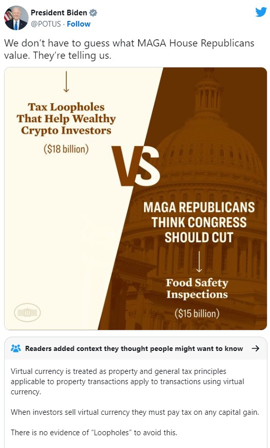 On Twitter, President Joe Biden shared an infographic urging to close "tax loopholes" benefiting wealthy crypto investors.